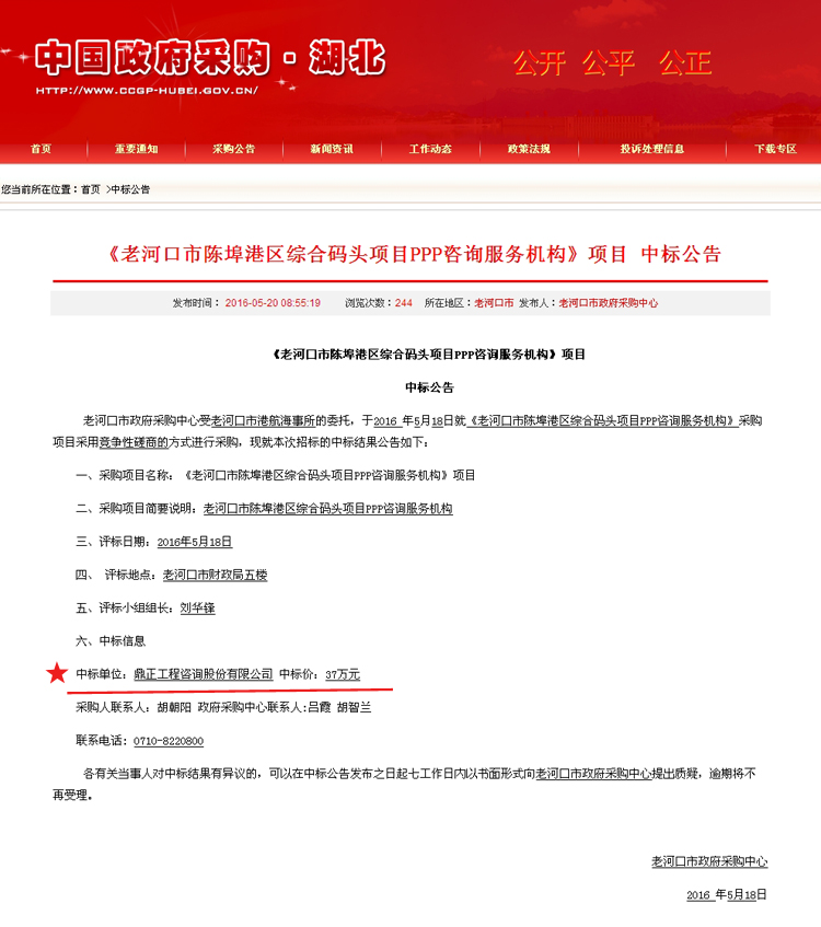 【經營成果】我司中標《老河口市陳埠港區綜合碼頭項目PPP咨詢服務機構》項目